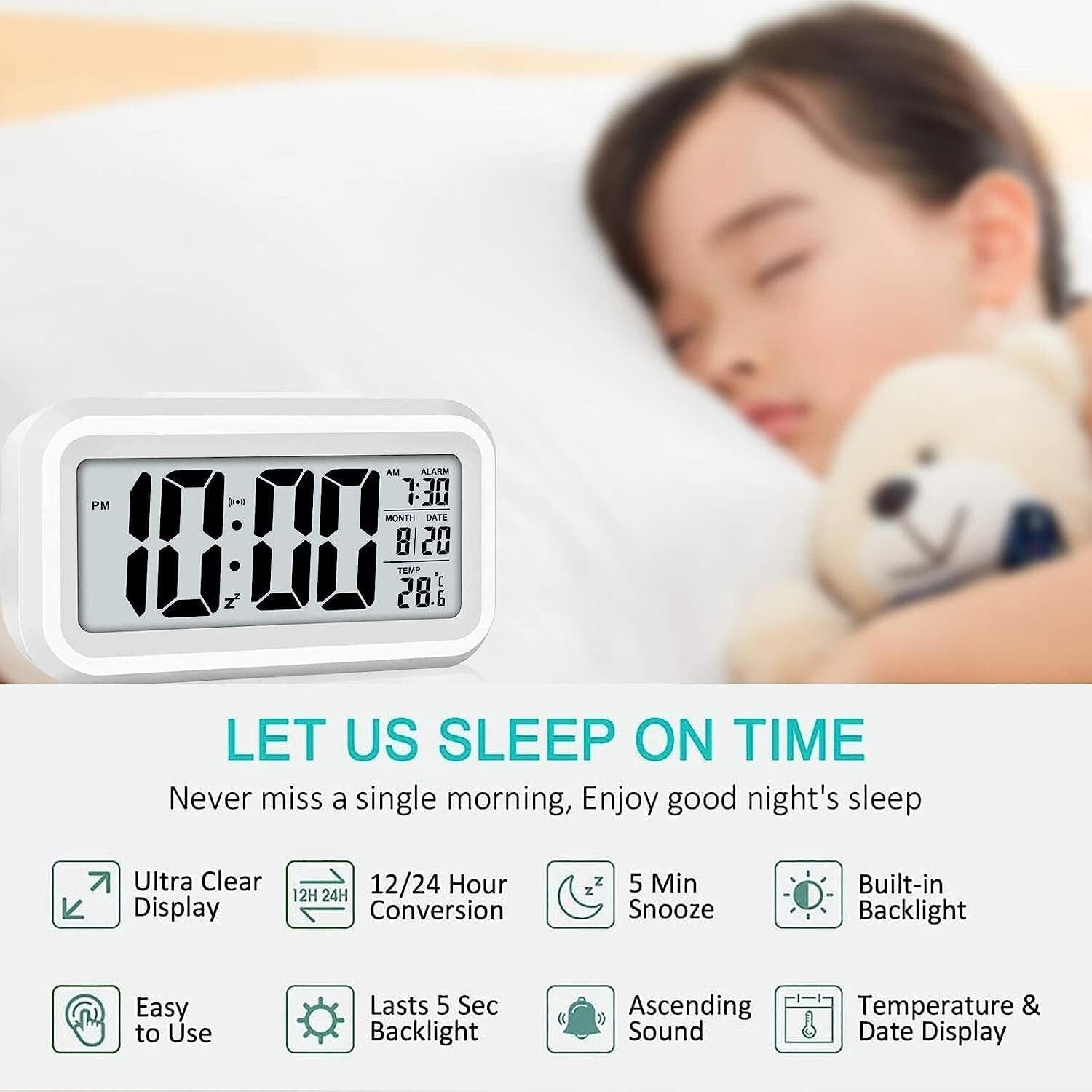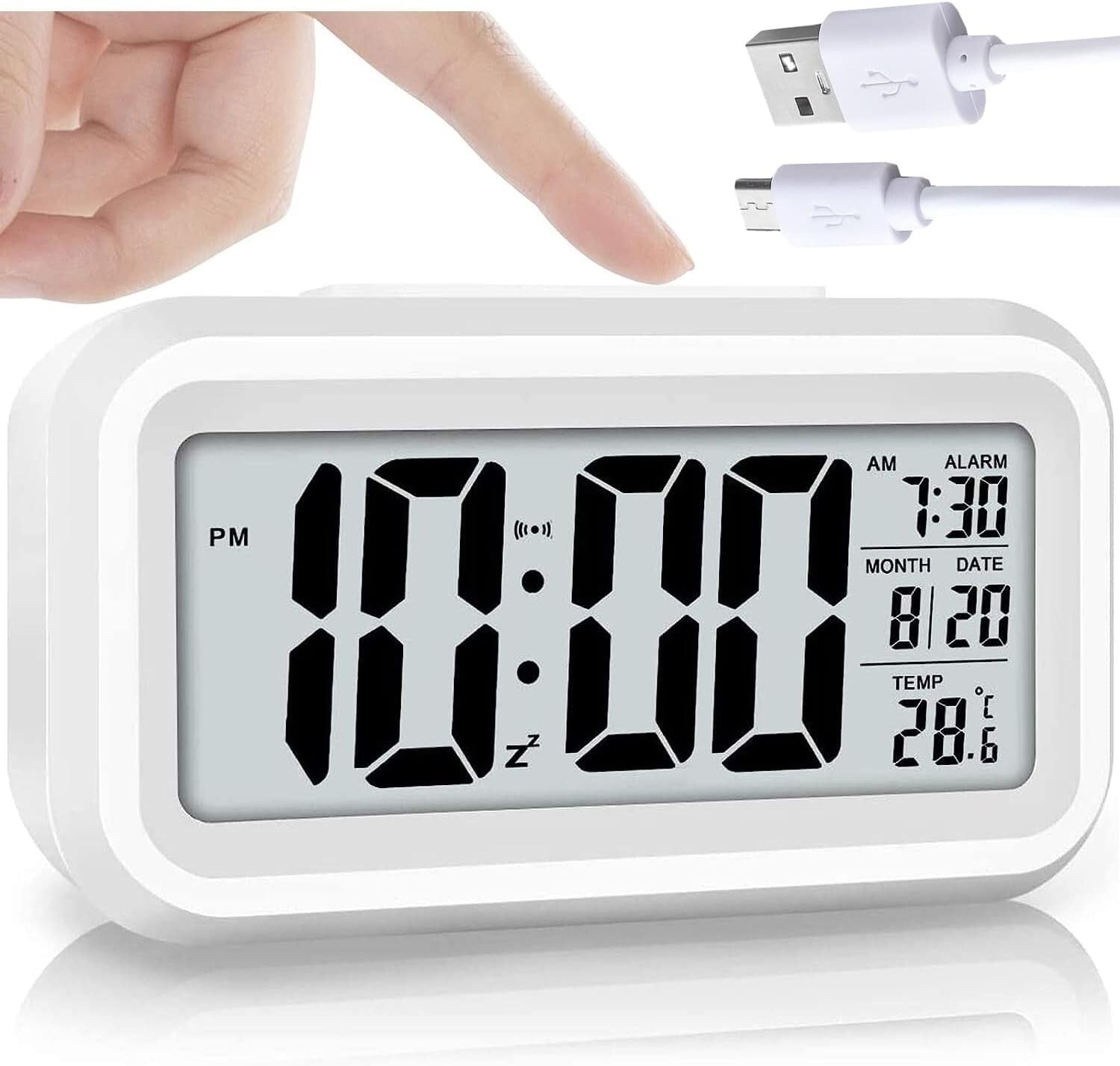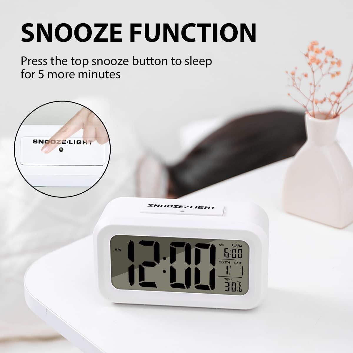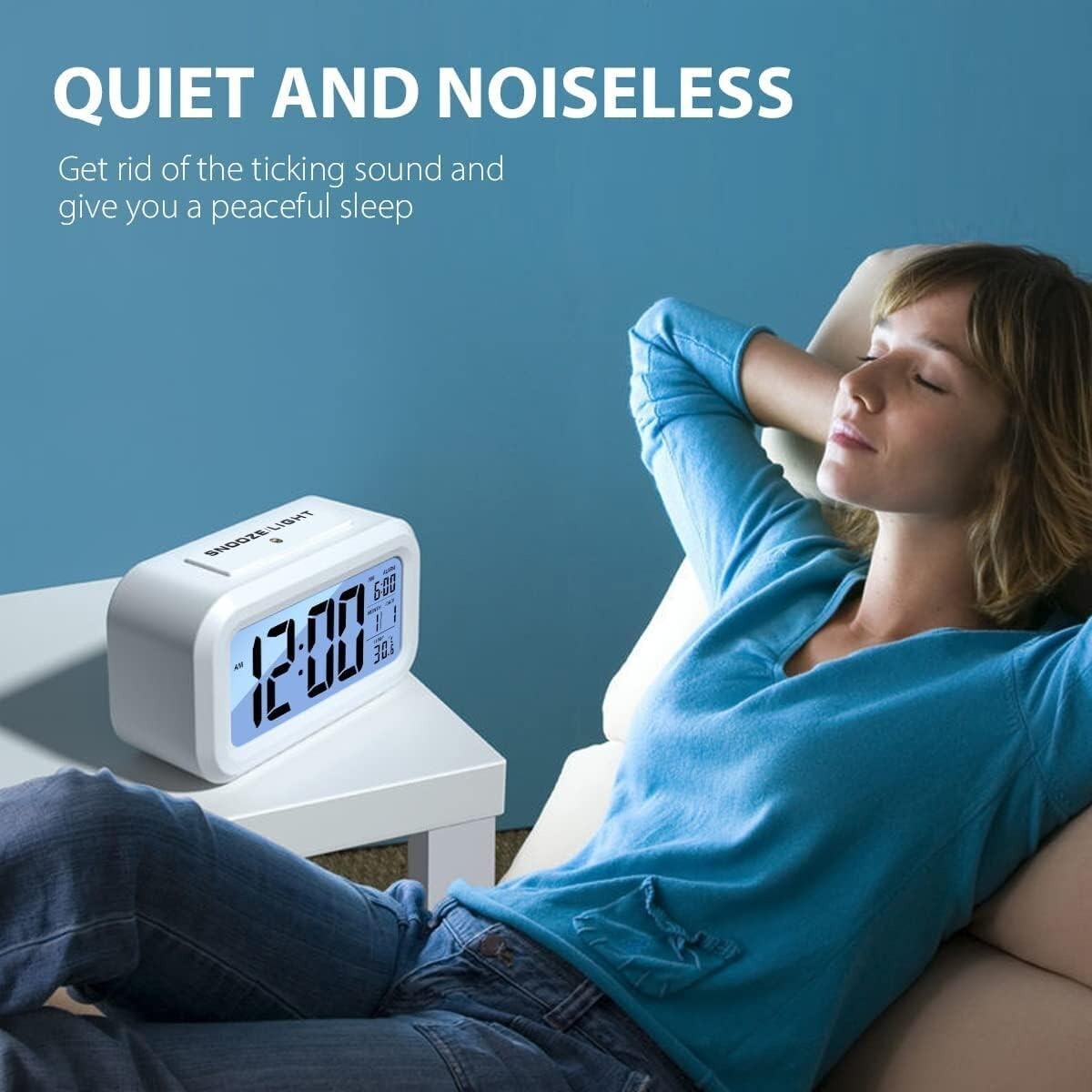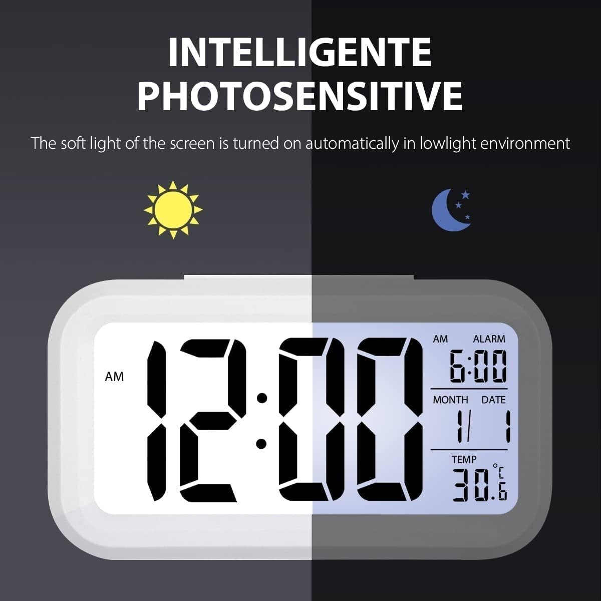 Luce notturna intelligente e sveglia senza ticchettio: la sveglia digitale ha automaticamente un sensore di luce ambientale integrato. Se la stanza è più scura, la notte sembra morbida e distinta, che ti facilita il sonno. Può anche essere chiuso. Se hai bisogno di una luce forte, una retroilluminazione può essere attivata premendo un pulsante