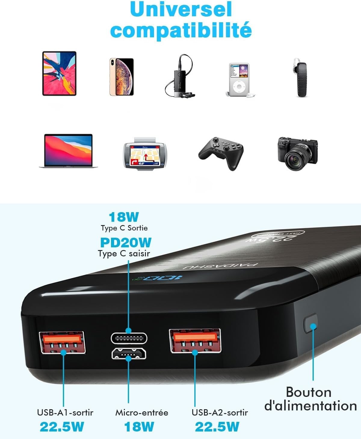 Power Bank 27000mAh per Cellulare Ricarica Rapida USB C con Display LED PAIDASHU