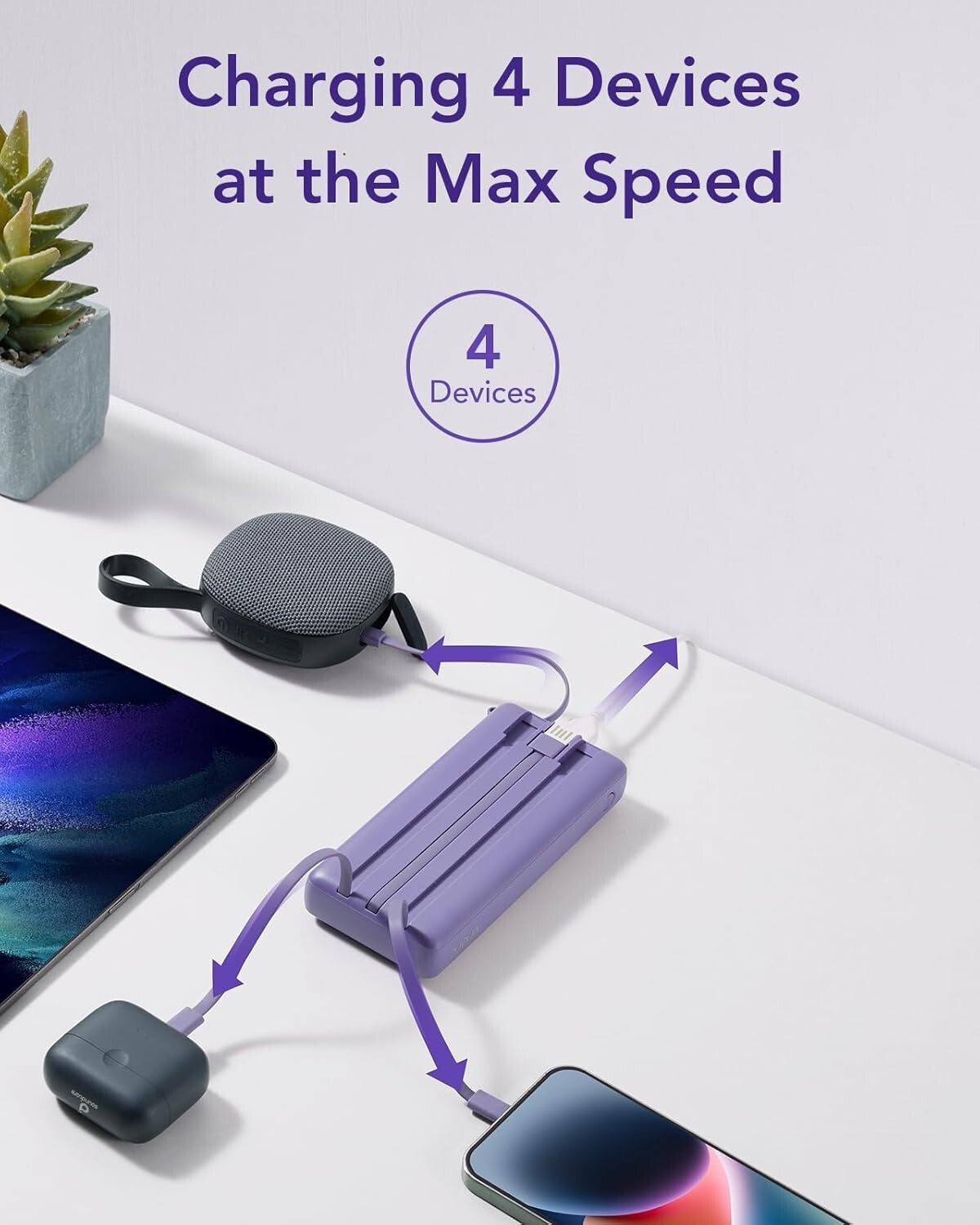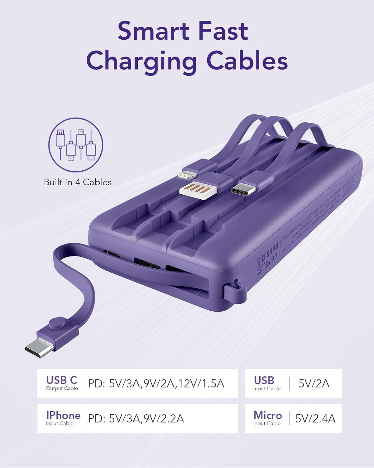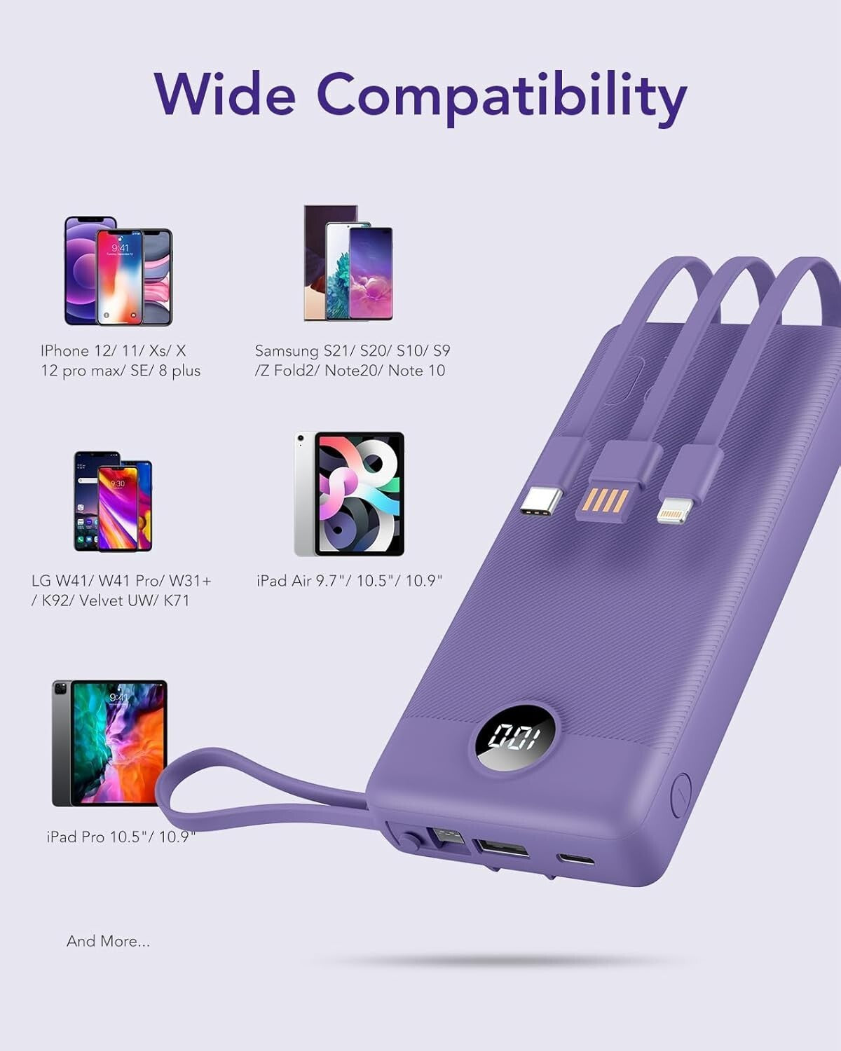 Power bank con cavi integrati: Caricatore portatile veloce da 20000 mAh, cavo USB-C integrato (9v/2a), cavo micro (5v/2.4a) e un altro cavo compatibile con iPhone. supporta la ricarica rapida direttamente per i telefoni cellulari, ha anche costruito un cavo di ingresso USB-A 5v/2a per la ricarica