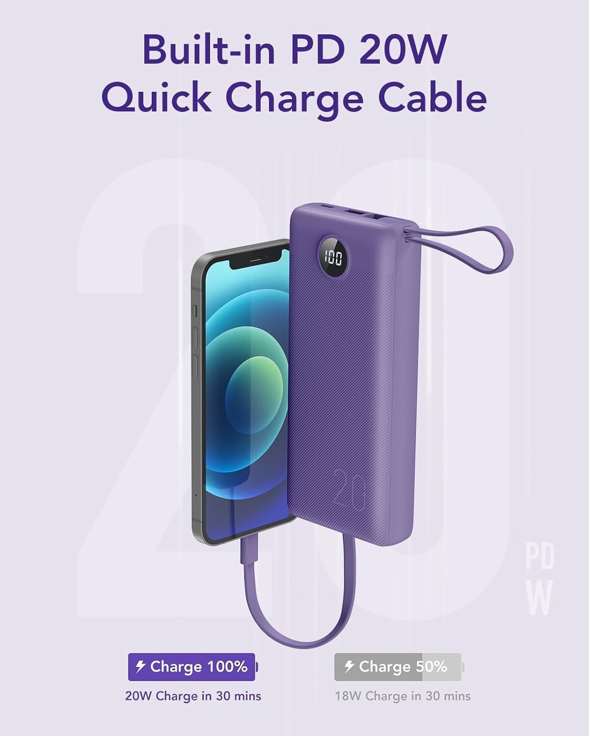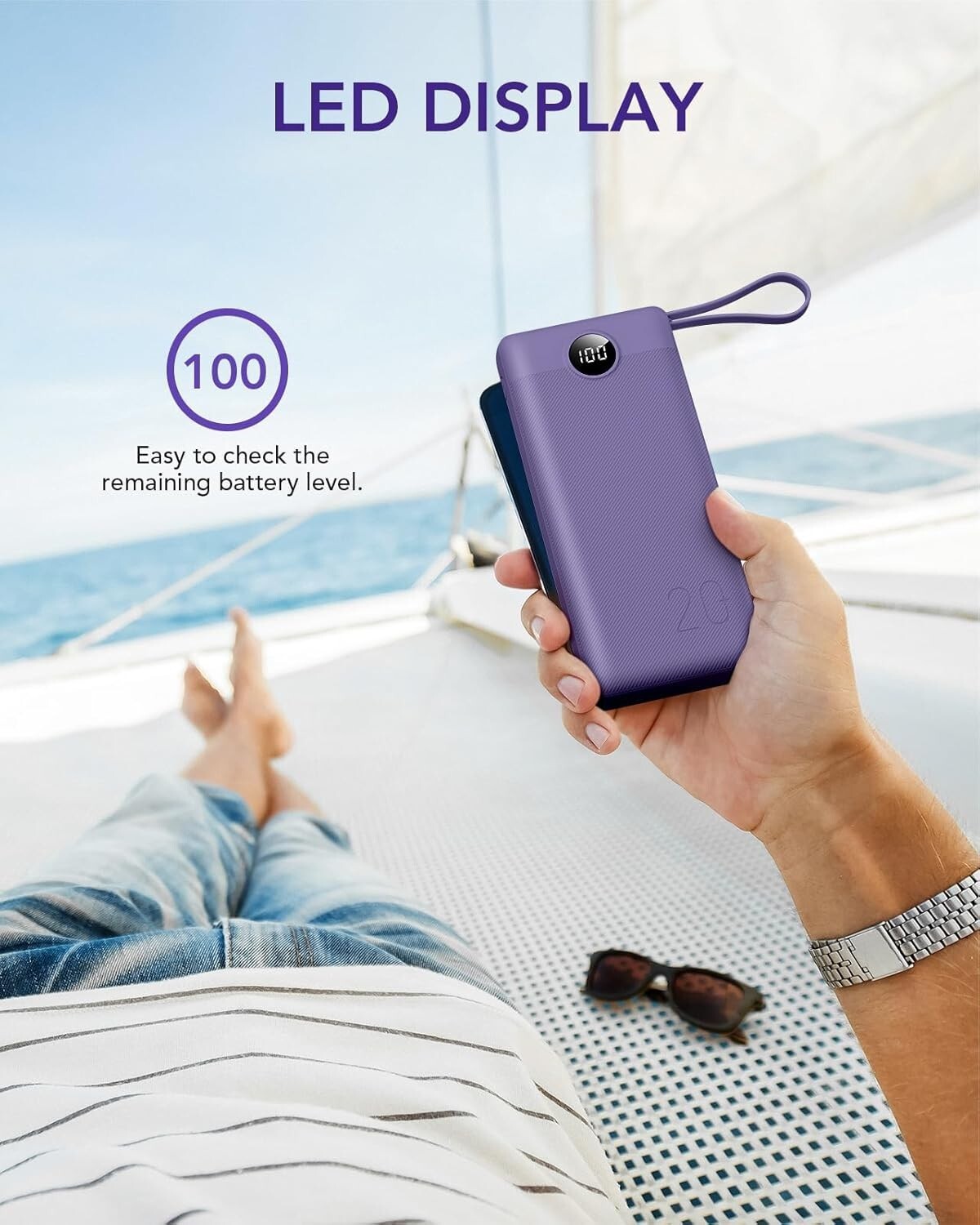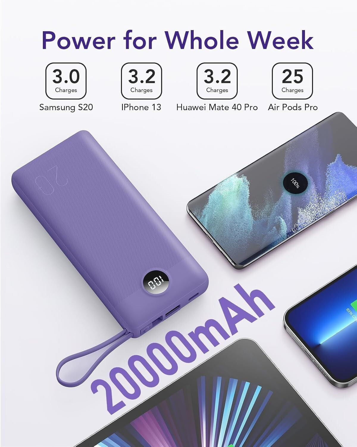 Alta capacità: Caricabatterie per telefono portatile integrato con cavo con grande capacità di 20000 mAh, puoi caricare la maggior parte dei dispositivi da 3 a 4 caricabatterie e non preoccuparti dello spegnimento. pacco batteria da viaggio per il tuo viaggio