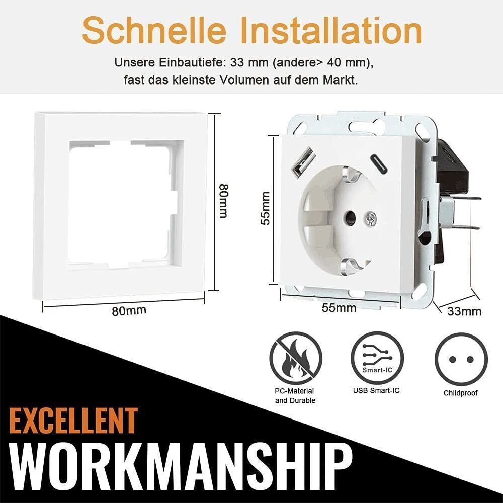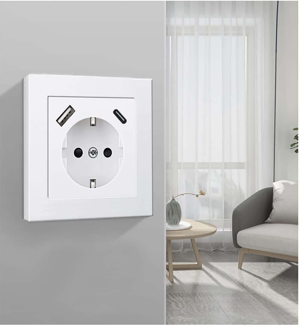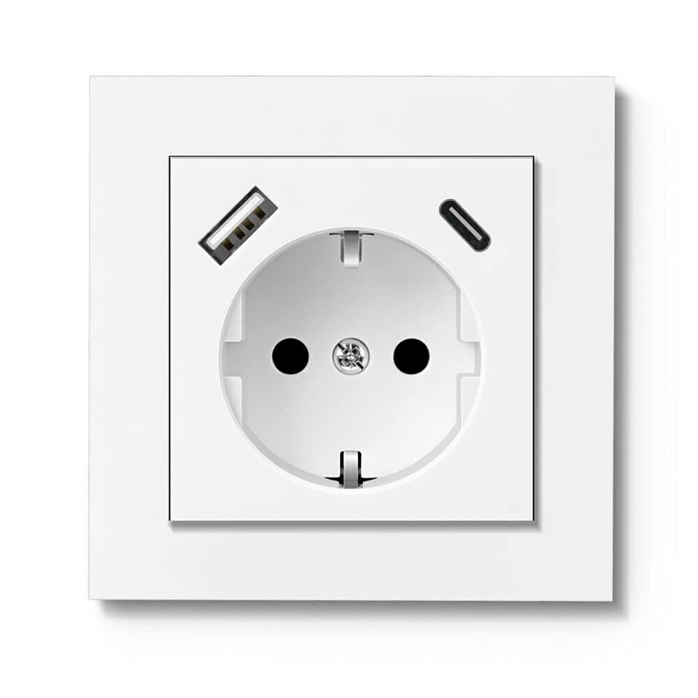 Presa USB, presa con caricatore USB e 1 porta di tipo C da 3,4 A, bianco puro lucido, presa Schuko da incasso, profondità della base: solo 33 mm, installazione semplice
