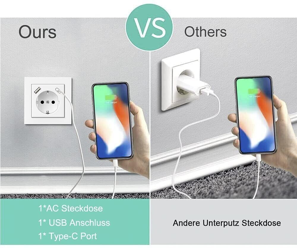 2 porte USB: presa con 1 porta di ricarica USB e 1 porta di tipo C (5 V x 3,4 A max). Soddisfa le diverse esigenze di ricarica per dispositivi Android o iPhone contemporaneamente. Ciò elimina la fastidiosa ricerca dell'alimentatore di rete e l'uso complicato di ciabatte.