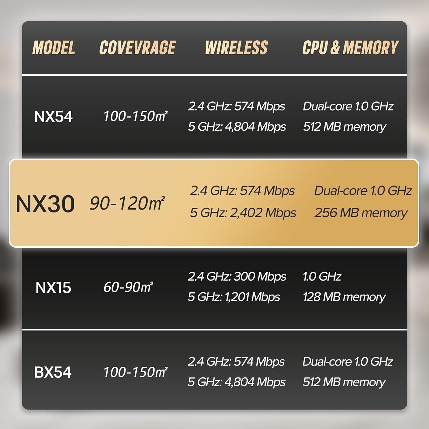 Wi-Fi 6 a 5 GHz: il router wireless Wi-Fi 6 Gigabit Dual Band *NX30 offre connettività ad alta velocità con 2,4 GHz a 574 Mbps e 5 GHz a 2402 Mbps. Il router Wi-Fi 6 H3C garantisce un accesso Internet senza interruzioni per i tuoi dispositivi.