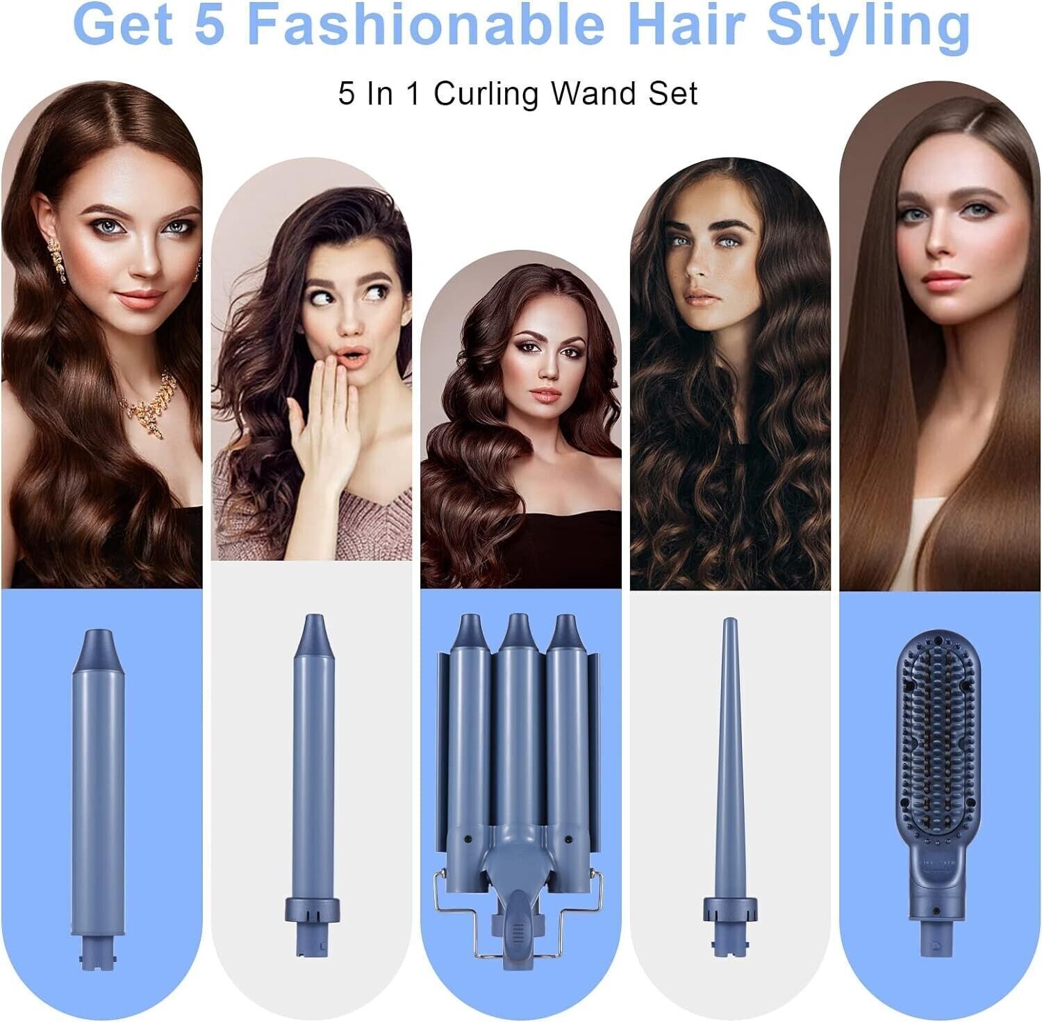 Set di bacchette arricciacapelli 5 in 1 con ferro in ceramica da 9mm-32mm, ondulatore a 3 cilindri, spazzola per lisciare i capelli, temperatura regolabile LCD 80-230°C