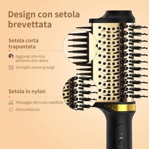 RISPARMIA TEMPO: la spazzola ad aria calda adotta un design di uscita dell'aria a 180°, che migliora efficacemente l'efficienza dell'asciugatura dei capelli e migliora significativamente l'effetto dello styling. I denti del pettine riscaldante laterale PTC pettinano efficacemente i capelli disordinati e aggrovigliati, garantendo un riscaldamento uniforme e rendendo i capelli asciutti e lisci più velocemente.