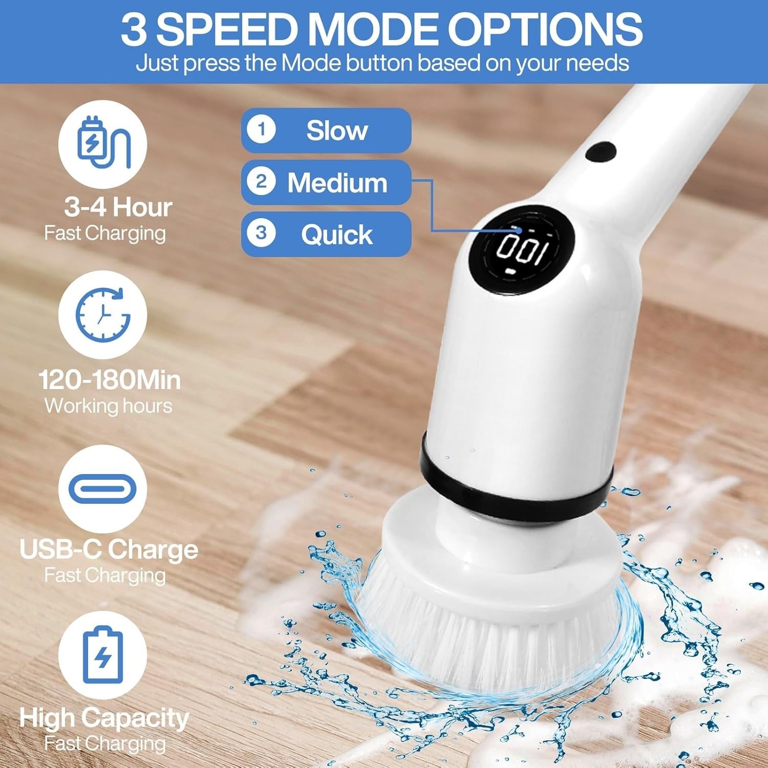 Ricarica rapida e indicatore di livello della batteria: la spazzola elettrica per la pulizia utilizza la ricarica rapida USB-C; la ricarica completa della batteria richiede dalle 3 alle 4 ore e può funzionare fino a 120-180 minuti dopo la ricarica completa. La spazzola elettrica per la pulizia è dotata di un chiaro indicatore di batteria, così non dovrai mai preoccuparti che la batteria si scarichi.