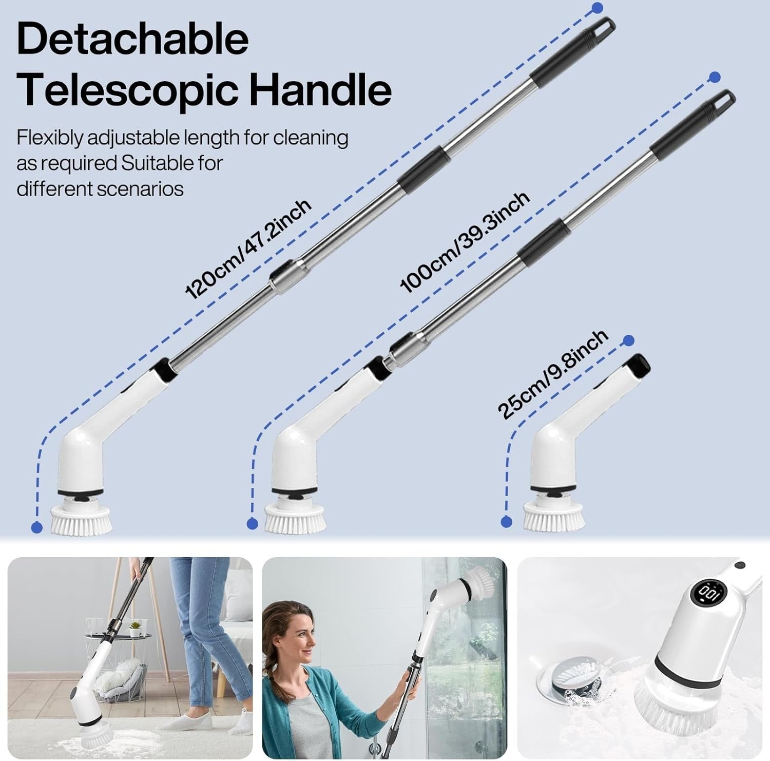 Spazzola elettrica con lunghezza regolabile: la spazzola elettrica con manico telescopico è disponibile in tre lunghezze: 25 cm, 100 cm e 120 cm per soddisfare le diverse esigenze domestiche. Che si tratti di una vasca da bagno o di una coperta, è facile da pulire senza doversi chinare ed è molto pratica da usare per prevenire dolori alla schiena e alle ginocchia durante le pulizie domestiche. Spazzola elettrica.