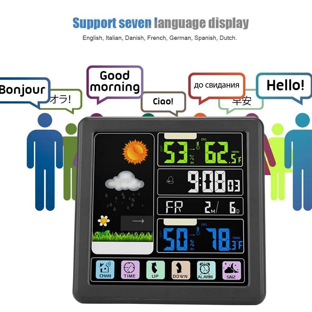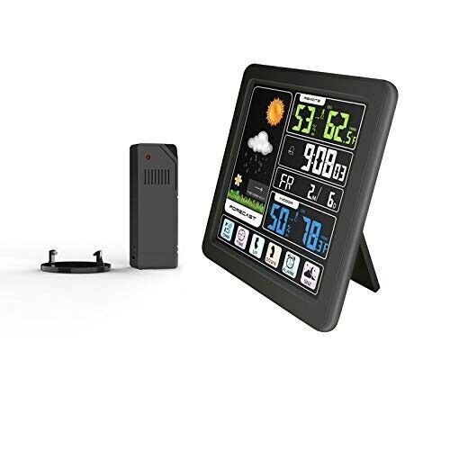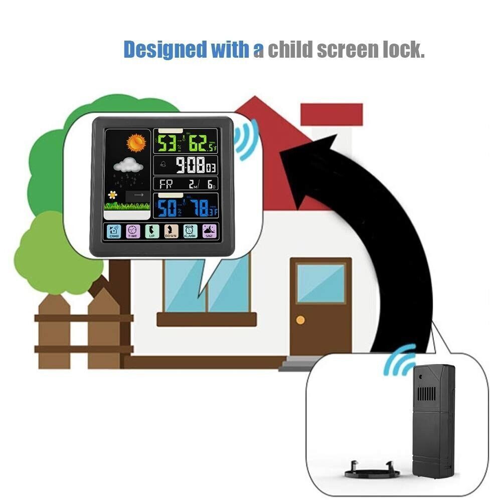 Stazione meteorologica wireless, TS-3310 LCD a colori Full Touch Screen Termometro esterno per interni Igrometro Stazione previsioni meteo con sveglia (Nero)