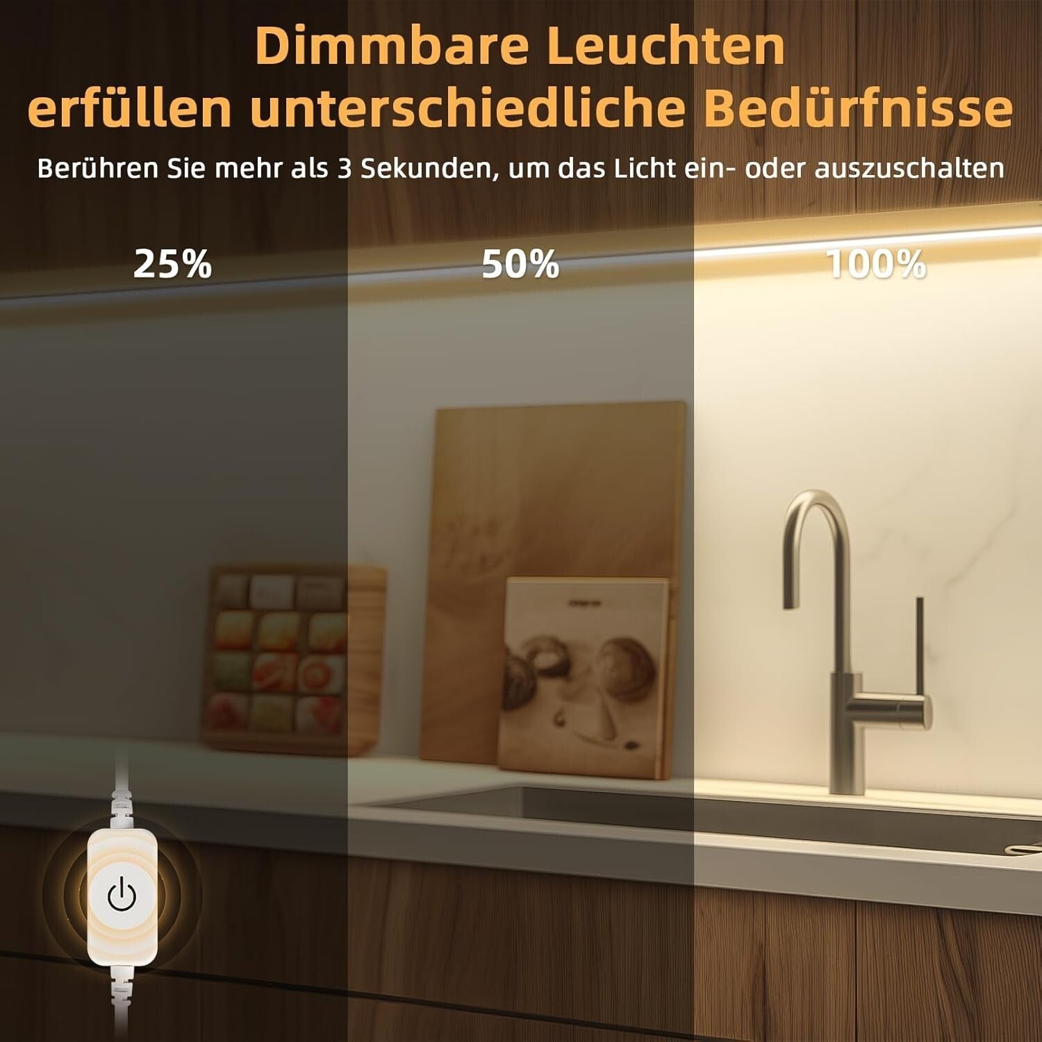 Controller dimmerabile touch: con una luce bianca calda da 3000 K, le luci per mobili sono dotate di un controller dimmerabile touch aggiornato: con una pressione prolungata del dimmer è possibile regolare l'intensità luminosa (da bassa a intensa) e una pressione breve per accendere/spegnere. È possibile regolare il livello di luminosità dal 10% al 100% a piacere, senza dover più effettuare fastidiosi reset da remoto per un utilizzo prolungato.