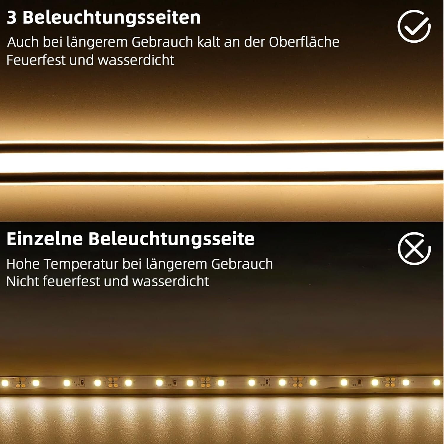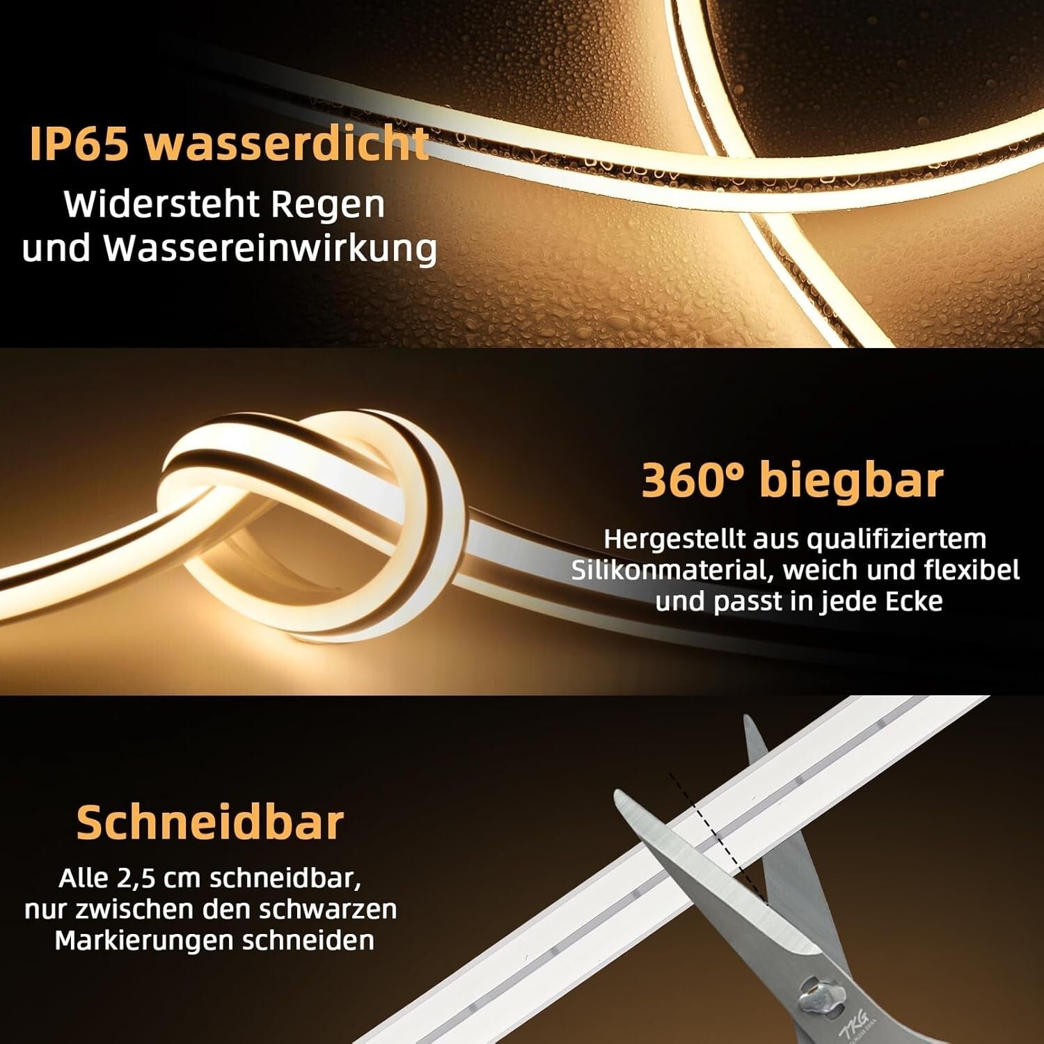 Impermeabile, sicura e di lunga durata: la striscia LED da 24 V funziona a bassa tensione, il che significa che genera pochissimo calore. La versione in silicone di ultima generazione è resistente al calore, garantendo la vostra sicurezza e una maggiore durata della vostra barra luminosa. La funzione di impermeabilità IP65 consente l'utilizzo in acqua, in piscina e all'aperto nei giorni di pioggia.