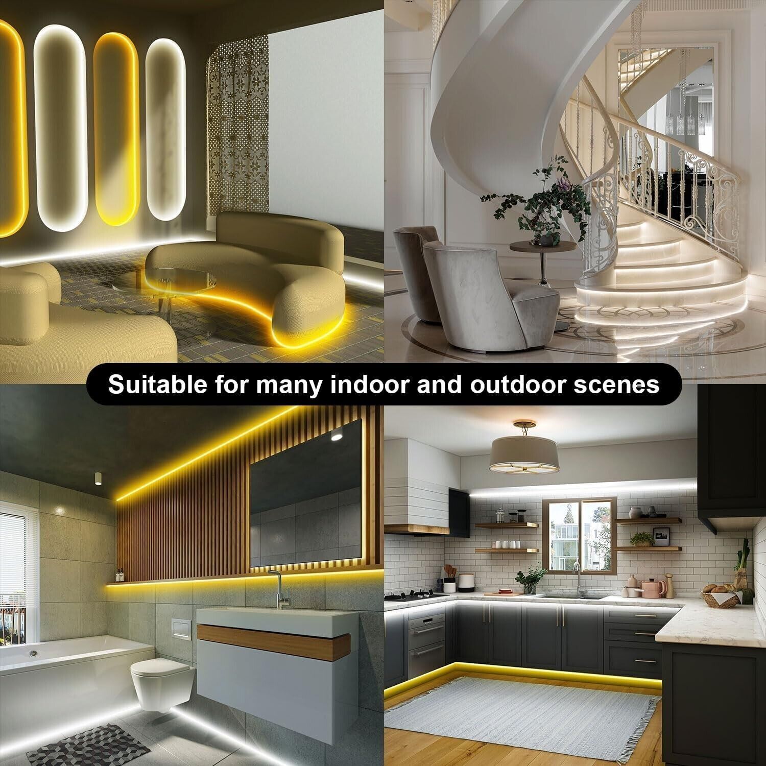 Striscia LED impermeabile IP67: il neon LED da 24 V funziona con bassa tensione e sicuro per uso domestico. Il suo grado di impermeabilità è IP67, cioè Antipioggia, antistatico e antipolvere, ma non per lunghe immersioni in acqua. Luci a LED adatte per ambienti interni ed esterni: bagno, balcone, cucina, camera da letto, sotto armadio, scale, patio, veranda, ecc. (Nota: il controller è stato migliorato per essere impermeabile, ma l'adattatore non è impermeabile)