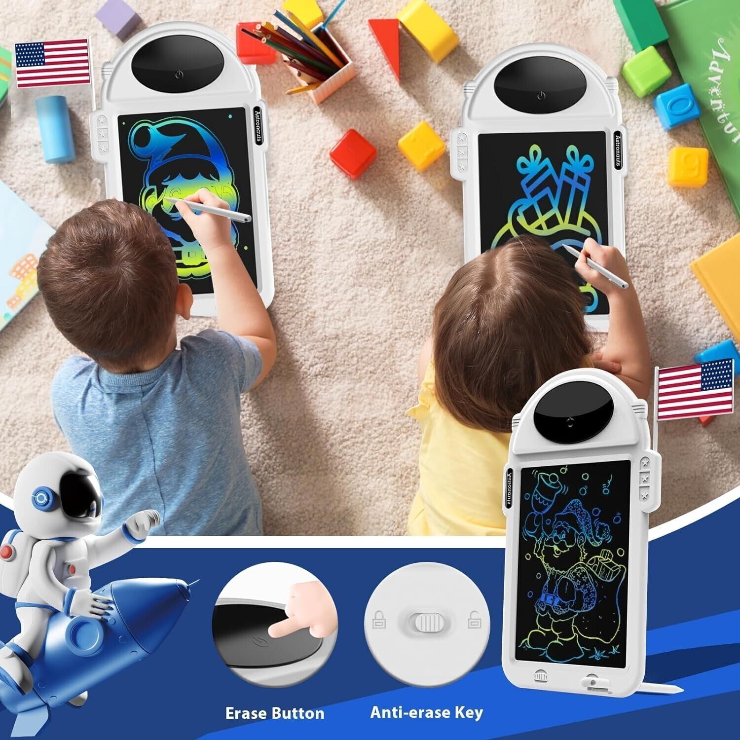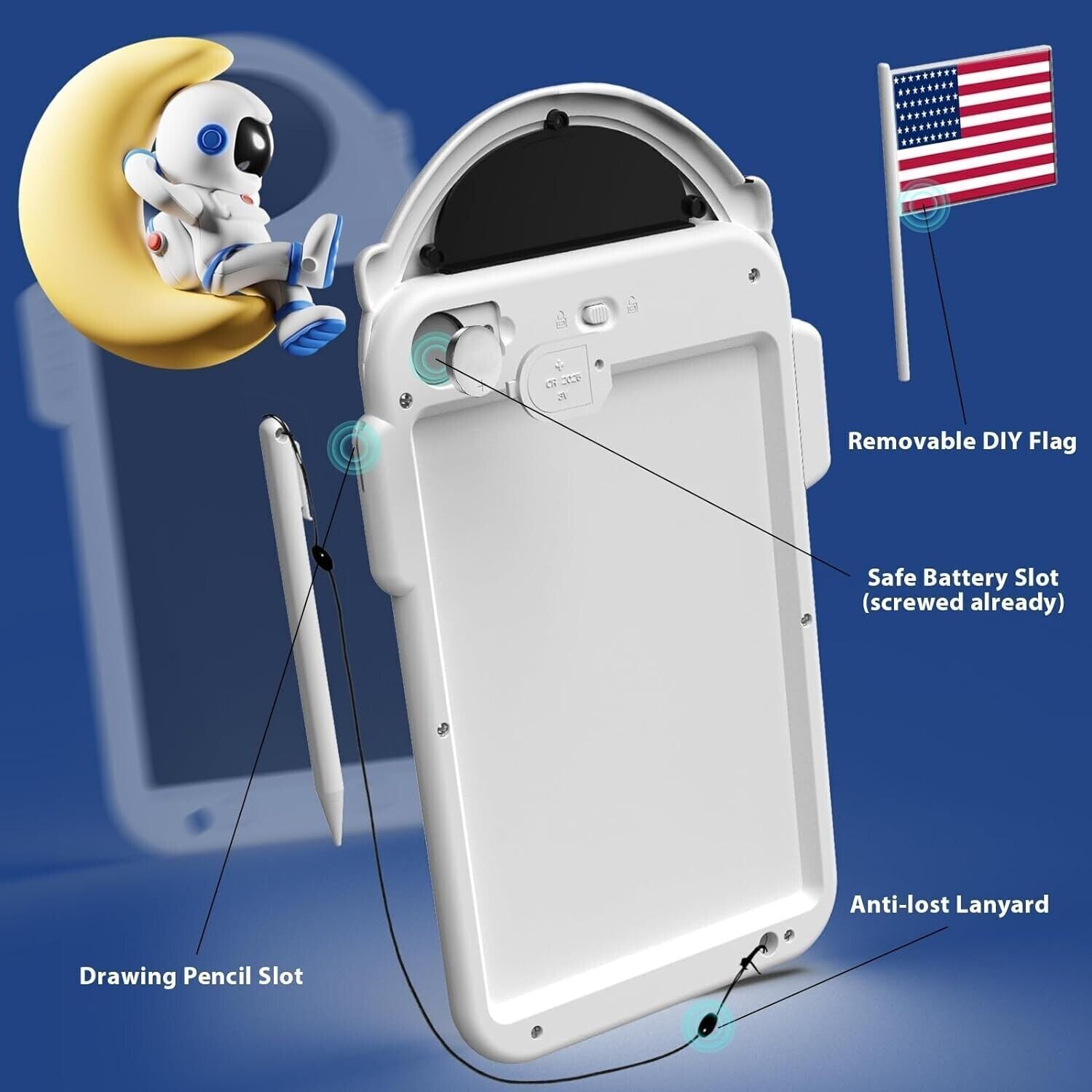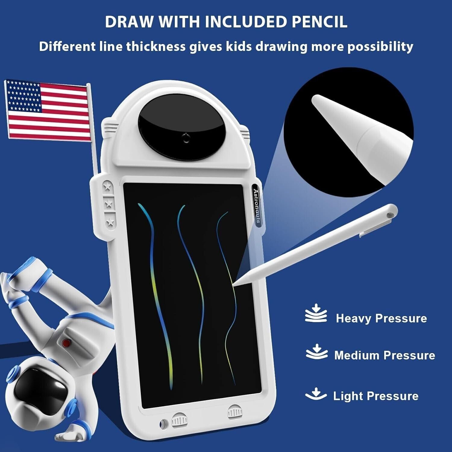 Elegante tavolo da disegno LCD: Con uno speciale design da astronauti, questo tavolo da disegno potrebbe sicuramente essere il regalo più unico per i bambini. L'ultimo schermo LCD a colori e la più recente tecnologia di visualizzazione con rilevamento della pressione, consentono ai bambini di dipingere e scrivere in modo più fluido sulla tavoletta da disegno. Disegnando con intensità diversa, i bambini possono modificare lo spessore delle linee, rendendole vivide e luminose sullo schermo.