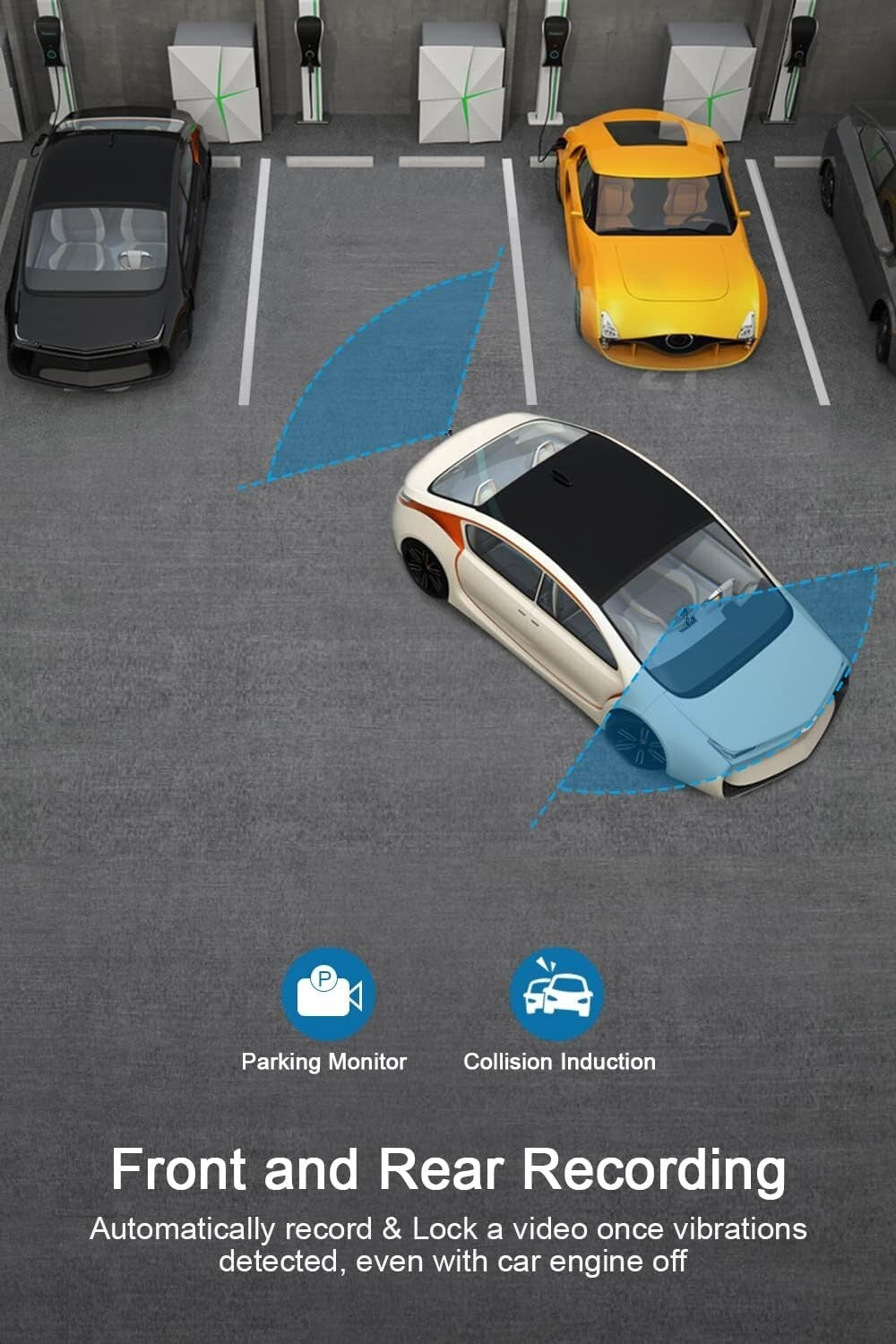 Ampio angolo di riprersa, Doppia camera: L´angolo di ripresa della telecamera auto frontale di 170 gradi, rende oggettivamente capaci di interpretare chiaramente, per la sua visuale ampia e senza punti ciechi, la scena ripresa. Con i suoi 120 gradi di angolo di ripresa la telecamera impermeabile posteriore, registra il video e segnala se non hai spazio per fare o continuare la retromarcia del veicolo.