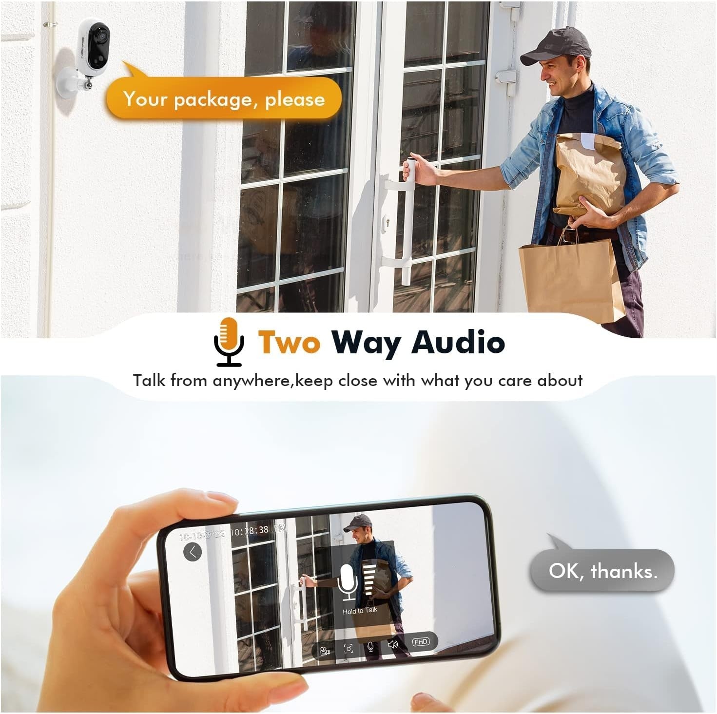 Audio bidirezionale e archiviazione su scheda Micro SD/cloud: grazie alla funzionalità audio bidirezionale, puoi parlare con le persone nella tua proprietà da qualsiasi luogo tramite l'app, interagire facilmente con le famiglie, ad esempio rispondendo agli automobilisti o persino agli intrusi tramite l'app del telefono. La telecamera esterna wireless supporta l'archiviazione sicura su cloud crittografata e l'archiviazione su scheda micro SD (fino a 128 GB).