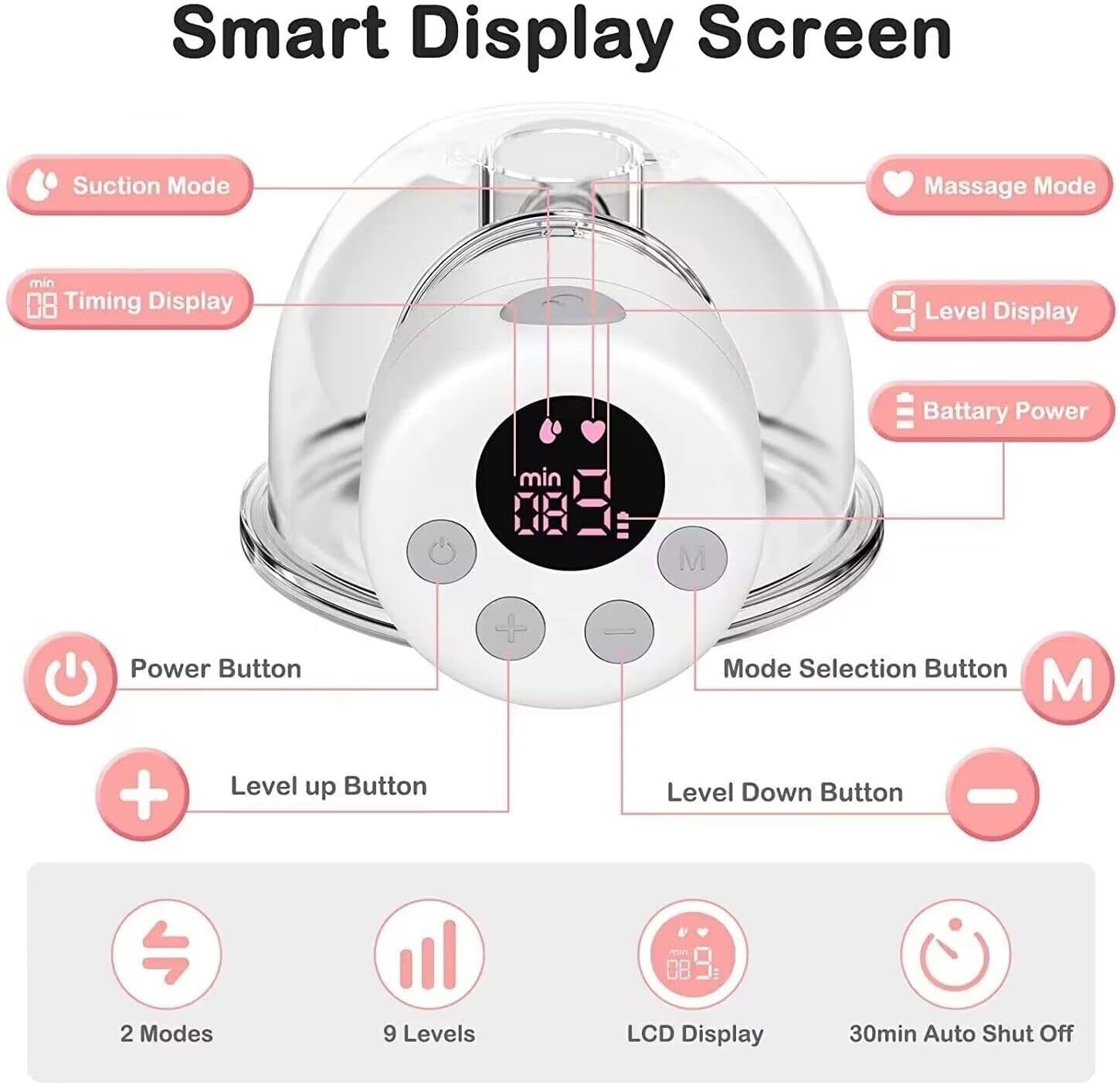 2 modalità e 9 livelli. Il tiralatte wireless ha 2 modalità: la modalità di aspirazione imita la frequenza di suzione del bambino, in modo che il latte materno possa essere estratto rapidamente. La modalità massaggio stimola il seno prima dell'estrazione, facilitando il rilascio del latte materno. Schermo LCD per un facile utilizzo con 9 livelli regolabili, funzione di memoria e spegnimento automatico dopo 30 minuti.