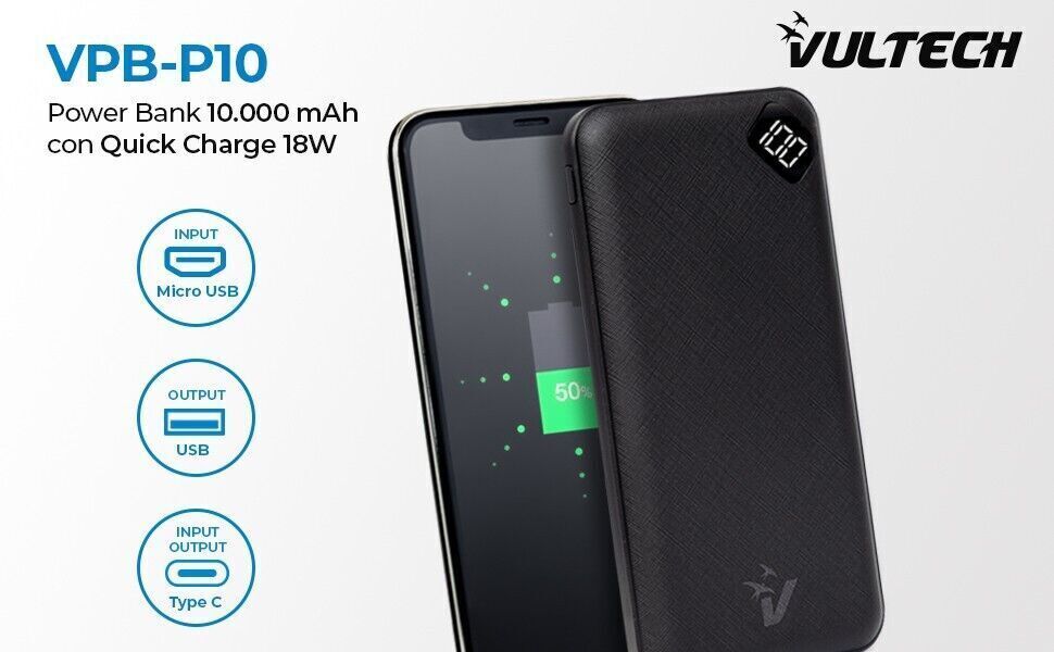 Mai più batterie scariche: Il Power Bank VulTech® VPB-P10B è una batteria portatile di ricambio ed è adatto per caricare le batterie di dispositivi mobili come smartphone, tablet, fotocamere, ecc.